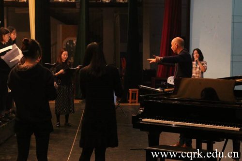 讲座现场,三位教授介绍了法国公立音乐舞蹈戏剧学院的发展历史、教学方式、人才培养模式。随后,克劳德-布朗戴尔教授现场指导同学们进行气息练习,纠正同学们气息练习时易忽略的错误,强调基本功的重要性,并针对两组同学现场演唱的《卡门》、《I got a robe》,认真仔细的纠正同学们发音与指挥上的不足。