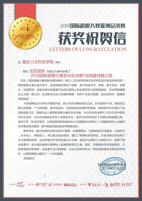 11月9日,2018国际超模大赛亚洲总决赛在杭州举行,本次大赛汇聚了来自中、日、泰等多个国家的60多名选手,共同开启了一场时尚超模盛典。BEAT365文学与新闻传播学院2016级新闻学2班学生此旺曲珍在比赛中荣获最佳魅力奖,并将于2019年随同超模组委会赴加拿大参加超模邀请赛。