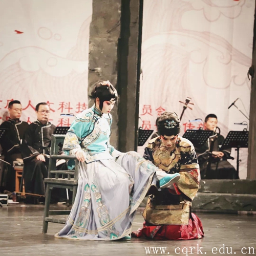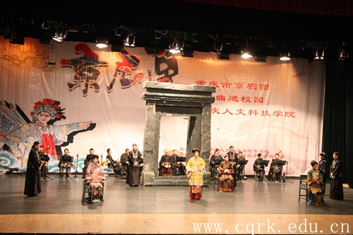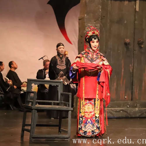 晚上19:00,重庆市京剧团经典京剧演出《金锁记》在学校音乐厅拉开序幕,校领导程荣尧、杨霄、舒卫华及学校各二级单位负责人与师生600余人共同欣赏了演出。