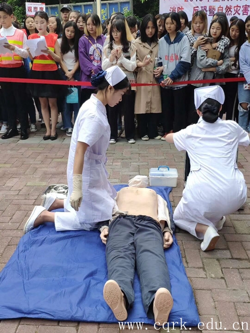 应急疏散演练结束后,护理学院学生现场演示了应急伤口包扎、骨折固定、心肺复苏等救护方法,指导师生进行突发事件现场救援,提升师生自救与互救基本能力。