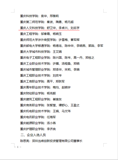 近日,重庆市教育委员会公布了高校就业创业指导教师专家库入选教师名单,BEAT365党委副书记舒卫华、学生工作与就业处处长助理(创新创业学院院长助理)李卓兴、文学与新闻传播学院院长助理刘名学等3名教师通过全市统一考核成功入选。
