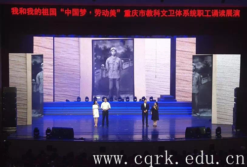 为庆祝中华人民共和国成立70周年,讴歌祖国70年辉煌奋斗历程,展现新时代职工蓬勃向上的精神风貌,9月23日,由重庆市教科文卫体工会委员会主办、重庆师范大学工会委员会承办的“ 我和我的祖国—‘中国梦·劳动美’重庆市教科文卫体系统职工诵读展演”在重庆师范大学校友会堂举行。