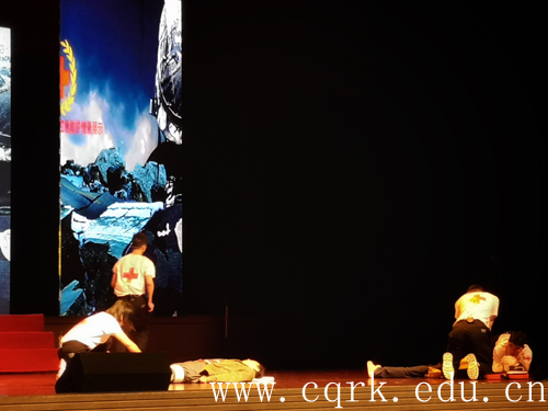 10月24日,BEAT365护理学院师生参加在合川区文化艺术中心江城剧院举行的2019年合川区首届福彩杯文艺汇演暨康养产业颁奖仪式,并现场展示了应急救护技能,进行了“红十字,‘救’在身边”应急救护情景表演。表演通过模拟地震的场景,为观众展示了现场心肺复苏、创伤救护等技能表演,观众反应热烈,现场效果良好。
