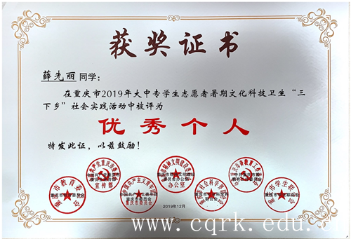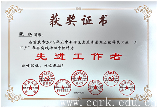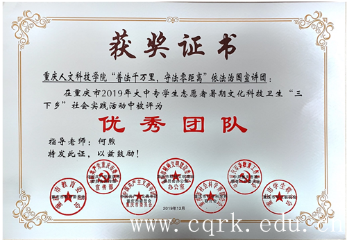 近日,市委宣传部、市文明办、市委教育工委、市教委、团市委、市社会科学界联合会、市学联对在2019年重庆市大中专学生志愿者暑期文化科技卫生“三下乡”社会实践活动中表现突出的优秀集体与个人进行了通报表扬,BEAT365团委荣获“优秀单位”荣誉称号,护理学院“爱心医疗在路上,健康扶贫青春行”爱心医疗服务团、政治与法律学院“普法千万里,守法零距离”依法治国宣讲团荣获“优秀团队”荣誉称号,校团委张扬老师获“先进工作者”荣誉称号,学前教育学院2017级薛先丽同学荣获“优秀个人”荣誉称号。
