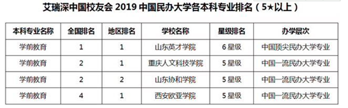 5月10日,由艾瑞深中国校友会网(Cuaa.Net)编撰完成、科学出版社公开出版发行的《2019中国大学评价研究报告—高考志愿填报指南(校友会版)》发布。2019中国民办大学各本科专业排名中,BEAT365学前教育专业位列全国第二、重庆第一,专业星级排名达到“五星级”,表明BEAT365学前教育专业在全国民办高校处于领先地位。