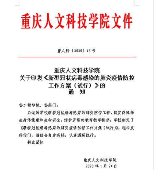 人文医院向全校师生发布了《新型冠状病毒感染的肺炎相关防治知识》,加强与合川区卫健委、合川区教委的联系,按要求做好了红外体温测量仪、N95口罩、外科口罩、消毒物品等相关防控物资的申购工作。特别设立了发热门诊,通过线上对全体医务人员开展病毒防范培训。据悉,从2月3日开始,校医院对学校进行大规模消毒工作。