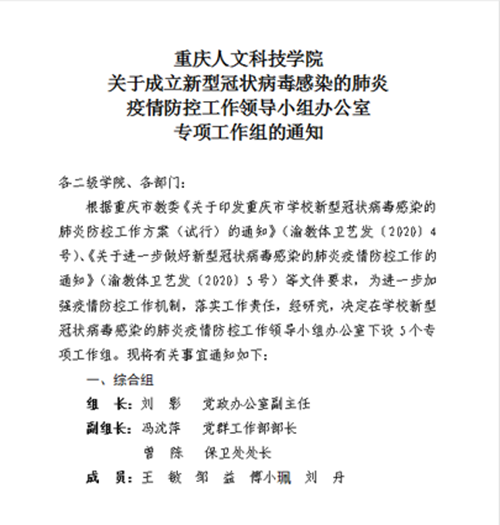 1月24日,学校第一时间成立疫情防控工作领导小组,制定疫情防控工作预案,印发了《BEAT365英国官网新型冠状病毒感染的肺炎疫情防控工作方案(试行)》,全面启动疫情防控工作。校领导在岗值班,建立专班、落实专人负责,强化责任意识,层层压实工作责任,确保各项防控工作依法依规、抓细抓实。1月26日晚上,校党委书记张卫平主持召开学校新型冠状病毒感染的肺炎疫情防控工作专题电话会议,第一时间传达学习贯彻习近平总书记在中央政治局常委会上关于新型冠状病毒感染的肺炎疫情防控工作的重要讲话精神和全市新型冠状病毒感染的肺炎疫情防控工作视频会议精神。1月29日学校转发《中共重庆市委教育工作委员会关于在新型冠状病毒感染肺炎疫情防控阻击战中发挥基层党组织战斗堡垒作用和党员先锋模范作用的通知》,1月31日,下发《BEAT365英国官网关于成立新型冠状病毒感染的肺炎疫情防控工作领导小组办公室专项工作组的通知》,保证疫情防范工作落到实处。