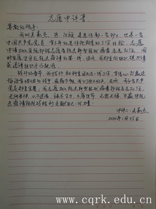 吴豪杰在他的“请战书”上写道:“战斗的春节,我始终和科室团队在一线工作,有信心打赢这场没有硝烟的战争。疾病不退,我们绝不收兵。在此,作为一名共产党员,我郑重宣誓,我志愿加入抗击新型冠状病毒感染的肺炎医疗队,无所畏惧,绝不退缩,竭尽全力。”