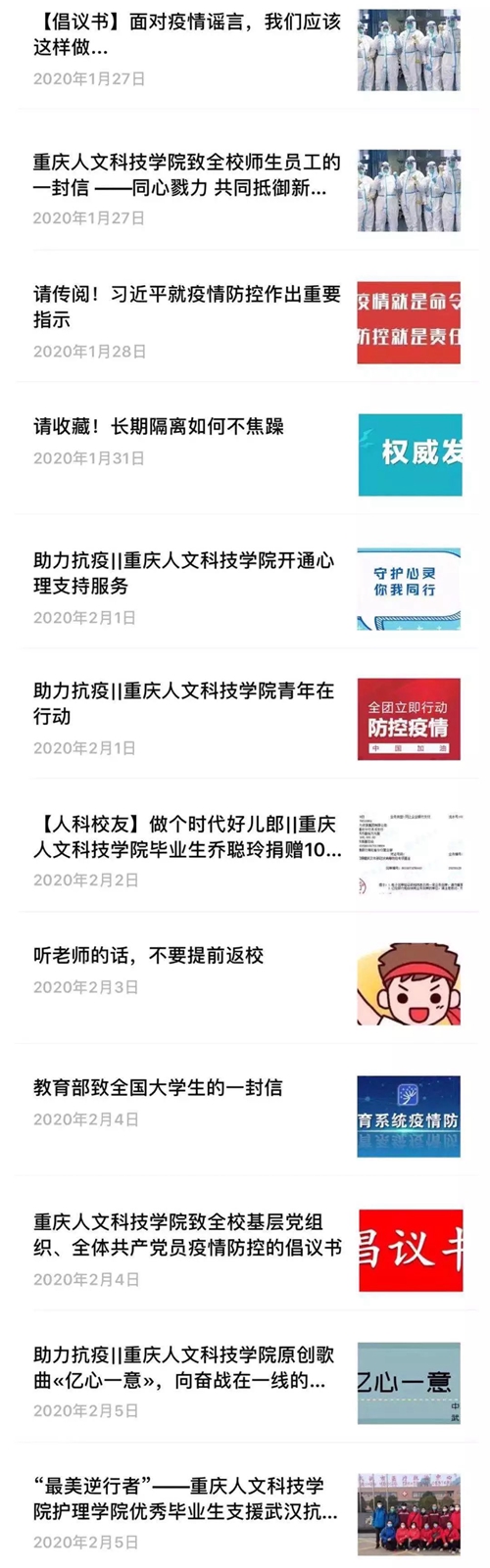 1月27日以来,党委宣传部在校园网、官方微信公众号发布了《致全校师生员工的一封信----同心戮力 共同抵御新型冠状病毒感染的肺炎疫情》《请收藏!这里有新型冠状病毒防控知识》《【倡议书】面对疫情谣言,我们应该这样做》《请收藏!长期隔离如何不焦躁》《听老师的话,不要提前返校》《致全校基层党组织、全体共产党员疫情防控的倡议书》《中共BEAT365英国官网委员会转发中共重庆市教育委员会关于在新型冠状病毒感染肺炎疫情防控阻击战中充分发挥基层党组织战斗堡垒作用和党员先锋模范作用的通知》《关于加强新型冠状病毒感染的肺炎疫情防控工作的通知》等,面向全体师生宣传普及疫情防治和防控要求,引导理性认识、科学防控疫情。
