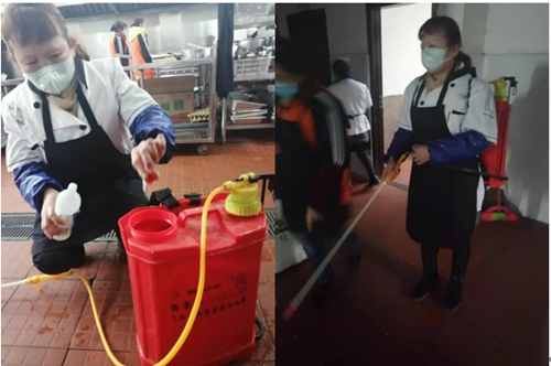 寒假期间全校只有教职工食堂正常经营,为提供一个安全卫生的用餐环境,既要做好保障工作,又要做好疫情防控工作,膳食科经常通过微信、电话等方式对食堂工作人员进行强调,严格执行食品卫生安全规定和学校有关疫情防控工作要求,坚持所有工作人员每天做好晨午检、上报健康状况,每天三次对食堂及周边消毒,仅对值班、留校的教职工开放,进入食堂时必须戴口罩、额温检测和身份验证登记和自带餐具、不在食堂就餐等制度,有效保障了师生正常生活。