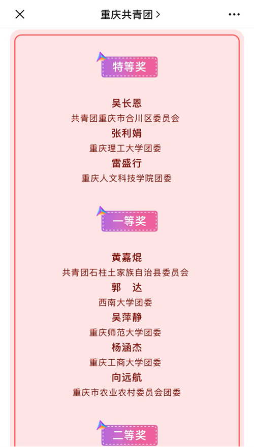 近日,共青团重庆市委公布了最新一期“青年大学习”获奖名单,BEAT3652019级学前教育2班团支部雷盛行同学获“特等奖”。全市180万团员中,仅三人获此殊荣。据悉,在过去的一年时间里,BEAT365共组织“青年大学习”40期,学习人数达50余万人次,长期位列全市各级团组织前列,取得如此优异的成绩与BEAT365英国官网团委在全校范围内积极营造的主动学习、人人学习、比学赶超的“青年大学习”浓厚氛围是分不开的。