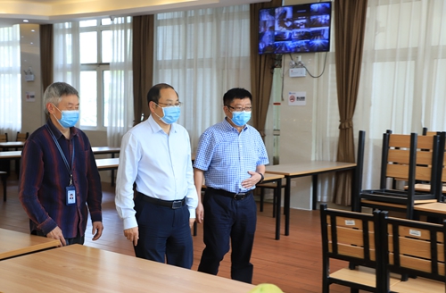 陈皎一行深入校园,实地考察了教职工食堂,询问学校开学准备及疫情防控措施等情况,详细了解了学校防护用品等物资储备情况和应急处置流程,听取了相关负责人工作汇报。