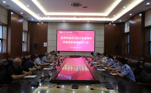 2020年9月8日下午,合川区公安局政委朱万军一行来校检查指导校园安全稳定工作并召开座谈会。学校党委书记张辉,副校长程荣尧,党政办公室、保卫处部门负责人陪同检查。