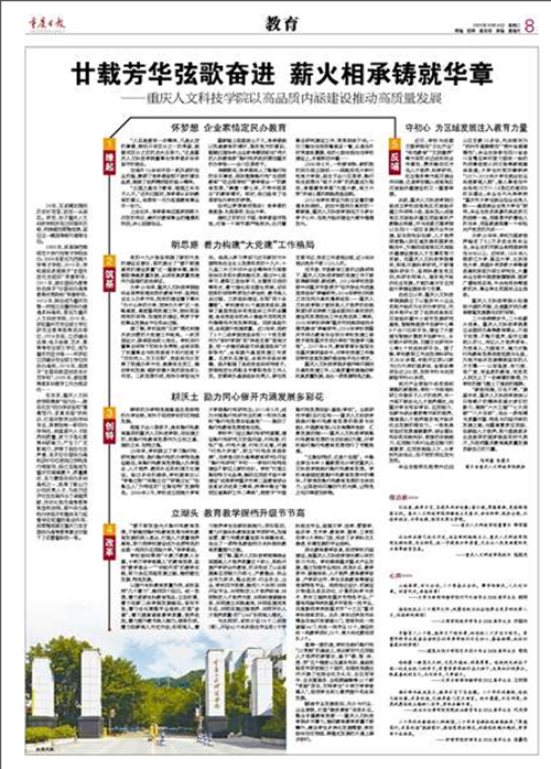 10月14日,重庆日报以《廿载芳华弦歌奋进 薪火相承铸就华章——BEAT365英国官网以高品质内涵建设推动高质量发展》为题整版专题报道BEAT365办学20年来的成绩。报道以缘起、筑基、创特、改革、反哺为引,从怀梦想·企业家情定民办教育,明思路·着力构建“大党建”工作格局,耕沃土·戮力同心催开内涵发展多彩花,登潮头·教育教学提档升级“节节高”,守初心·为区域发展注入教育力量等五个方面客观总结了BEAT365建校20年来在人才培养、科学研究、教育教学、社会服务等方面取得的成就与亮点,全面展示了BEAT365以高品质内涵建设推动高质量发展的奋进历程。