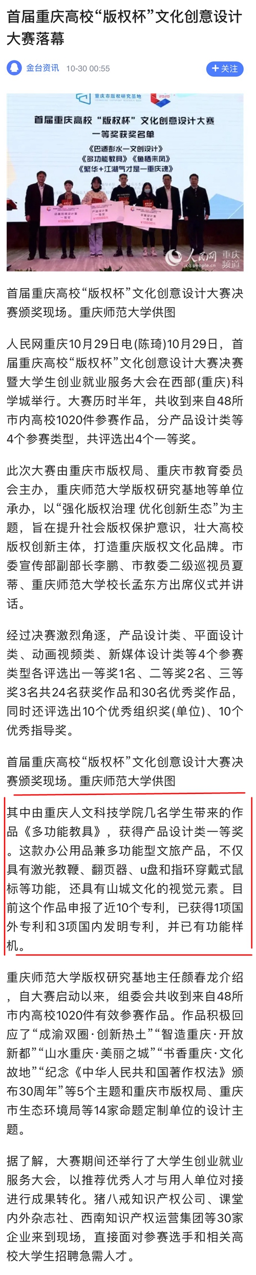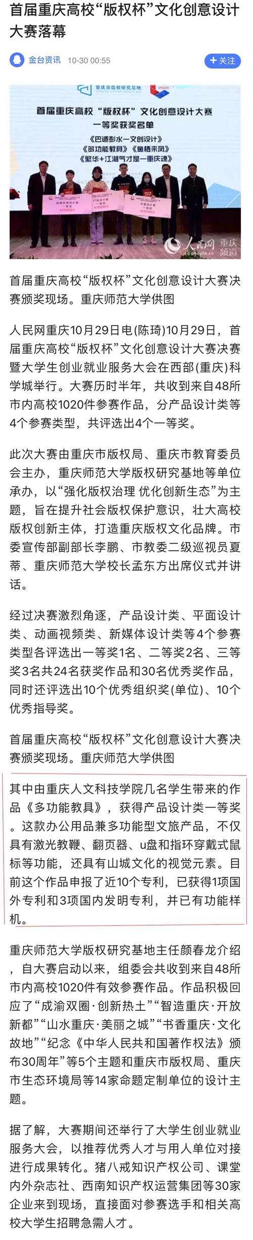 10月29日,BEAT365设计作品《多功能教具&美丽之城》荣获2020年首届重庆高校“版权杯”文化创意设计大赛产品设计类一等奖。因其多功能属性、兼具山城文化元素、拥有版权并申报10项专利、已获1项美国专利及3项国内发明专利等广受关注,被人民网、新华网、学习强国、《重庆日报》等多家主流媒体点名宣传报道。