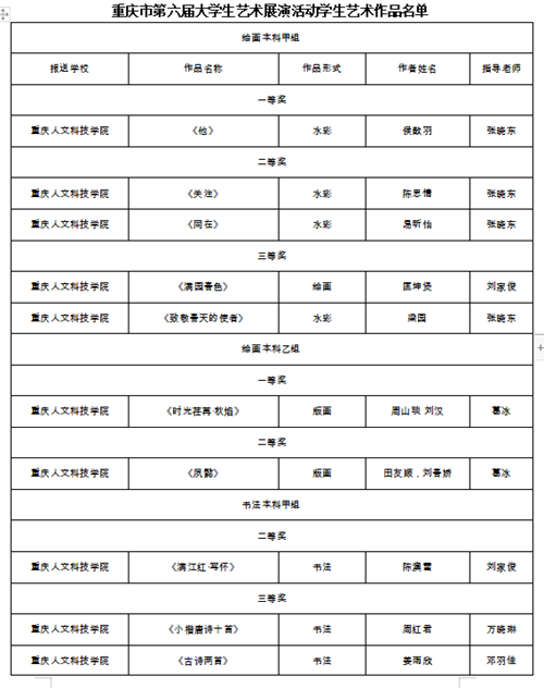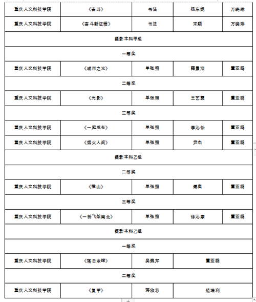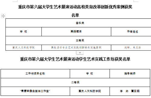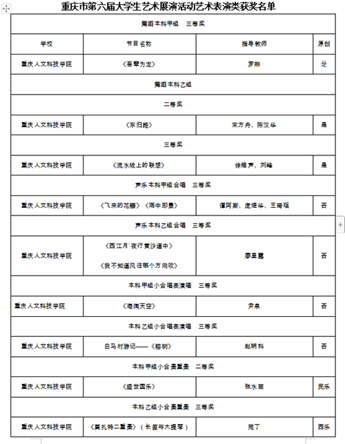 截止2020年11月,经过全面动员、认真准备、积极参加,BEAT365在第六届重庆市大学生艺术展演活动(简称“大艺展”)中斩获众多奖项,其中一等奖5项、二等奖12项、三等奖19项。