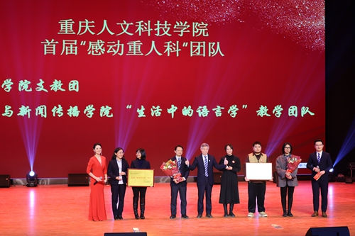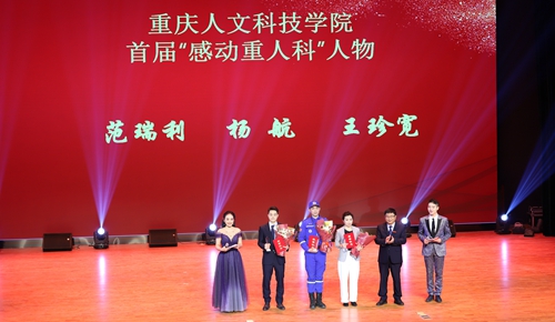 晚会上,首届“感动重人科”感动人物和感动团队揭晓。艺术学院支教团、文学与新闻传播学院“生活中的语言学”教学团队获得首届“感动重人科”团队,艺术学院教师范瑞利、团委干事杨航、体育学院学生王珍宽获得首届“感动重人科”个人。