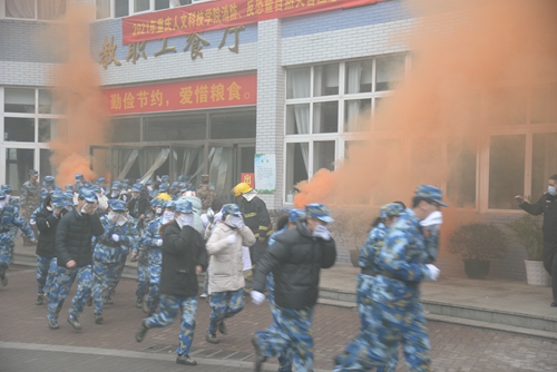 演练中,一名“犯罪分子”持刀追砍3名学生,学生逃往教职工食堂,“犯罪分子”实施纵火,瞬间火光冲天,烟雾弥漫。食堂工作人员立即拨打校园110电话报警,同时迅速切断总电源并紧急疏散师生。二、三楼被困师生在学生安全引导员的指引下,用湿毛巾或浸湿衣物捂住口鼻,低身有序快速撤离火灾现场到避难场所。学校保卫处在接到报警后立即报告校领导,同时迅速启动防恐和火灾事故处置应急预案。15﹕07分,学校保卫处、消防队、保安大队、校医院先后赶到现场,扑灭火灾,封锁警戒,搜捕并迅速制服“犯罪分子”,进行救灾点搭建、搜救转移伤员。最后消防队员在仔细搜查完各楼层,确保人员全部疏散后撤离事发现场。演练从开始到结束历时10分钟,精彩表现让现场响起热烈掌声。