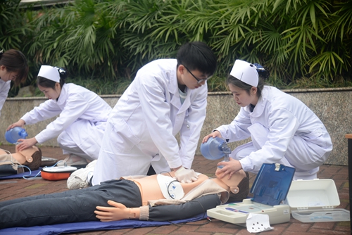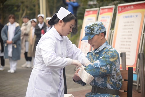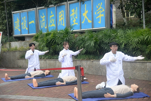 演练中,护理学院学生现场演示应急伤口包扎、骨折固定、心肺复苏等,较好展示突发事件应急救援方法,有效提升师生自救互救能力。