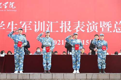 大会在庄严的国歌声和升旗仪式中拉开帷幕。随着“迎军旗”的口令响起,共有8项内容的汇报表演正式开始。首先进行的是停止间队列动作展示,5200余名同学军容严整,队列整齐,动作标准,展示了良好的队列训练成果;分列式上,54个军训连队组成的54支方队,在雄壮的军歌声中,精神抖擞、步伐整齐、口号响亮、意气风发、气势磅礴地依次走过主席台,接受领导和教官检阅;随后军体拳、战术攻防演练、匕首操、手语操表演依次登场。田径场上,整齐威武的喊杀声、模拟战场环境的硝烟、快速规范的战术动作、强劲有力的刺杀操练迎面而来,《人民军队忠于党》《士兵小唱》《人生五字经》《国家》等歌声中手语操整齐划一,“八一”、“军刺”、“1921-2021”、“厚德笃行、求真创造”校训首字母等10余种图形不断展现,巨幅党旗向天展示,催人奋进;在响彻云霄的《强军战歌》声中,汇报表演划上完美句号。新生们在为期近两周的训练里,刻苦努力,迎接挑战、挥洒汗水,将自己磨练成为一名英姿飒爽的“准军人”,充分展示了新时代大学生的良好素养和重人科“厚德笃行、求真创造”的育人风范。