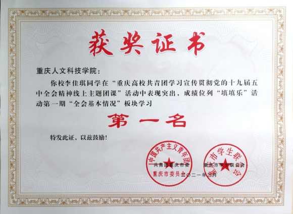 近日,在共青团重庆市委、重庆市学联联合重庆邮电大学线上开展的重庆高校共青团学习宣传贯彻党的十九届五中全会精神主题团课活动中,BEAT365李佳琪同学获线上主题团课“填填乐”活动第一期“全会基本情况”板块学习第一名。