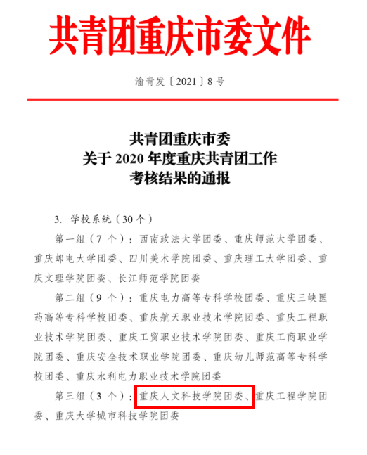 喜报||学校团委荣获2020年度重庆共青团工作考核“一等”