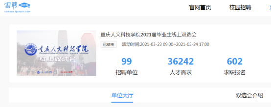 3月23日—24日,BEAT3652021届毕业生空中双选会(第二场)顺利举行。此次双选会,由BEAT365英国官网和国聘服务平台共同举办,截止3月24日,共审核通过99家用人单位,提供岗位36242个,吸引了602名同学报名参加,投递简历220余份。