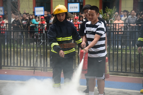 消防队员指导参演师生使用干粉灭火器