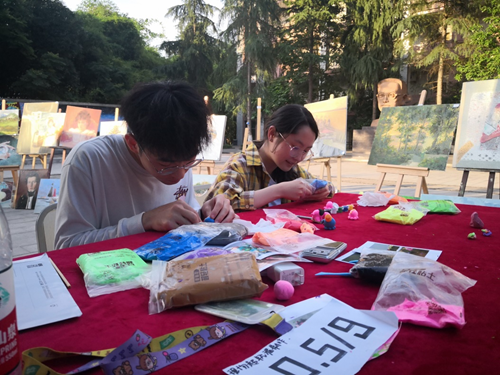 活动现场分为画作区、手工作品区、体验区。其中画作区的所有美术作品,均由艺术学院美术专业学生无偿捐赠;手工作品区的作品均是由艺术学院学生第一党支部、庠园六舍党员服务站的党员同志手工制作。