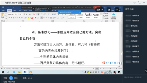 在线参与的同学纷纷表示受益匪浅,收获良多。在随后的互动中,同学踊跃提问,思政专业的袁耀晴同学咨询道:“大三下才来准备考研是否为时已晚?”周教授认为:“来得及、来不及都是相对的。‘磨刀不误砍柴工’,重点在于个人的投入及对知识的掌握程度。”学前教育专业的周建妮同学就跨专业考研提出问题:“教育学跨考学科思政跨度大吗?怎么选择方向呢?”周教授的回答强调了讲座中“知己知彼”的观点:“跨专业考研首先要看自己的兴趣,提前了解相关教材知识,如果对自己来说不是特别难,那就是可以的,文科的知识都是相通的,在答题时附上自己学前专业知识,会更有利。”