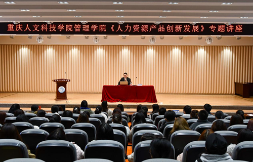 讲座中,乔聪玲以自身从事人力资源管理行业的经历开始讲述,调动了现场师生的参与积极性,现场氛围热烈。随后,乔聪玲从人力资源产品来源、人力资源行业和资本市场的关系、人力资源行业现状、人力资源行业与政府政策、人力资源产品走向、行业展望等六个方面展开讲解,在讲解过程中,他运用大量数据分析了当前重庆市人力资源相关产业的发展前景,进一步激发了学生对所学的专业的认同感。此外,乔聪玲还从企业用人、选人的要求方面充分论述了当下社会对人才的定义,并对同学们寄予厚望,希望学子们能够珍惜时间,努力学好专业知识,与时俱进,成为社会国家所需要的专业人才。