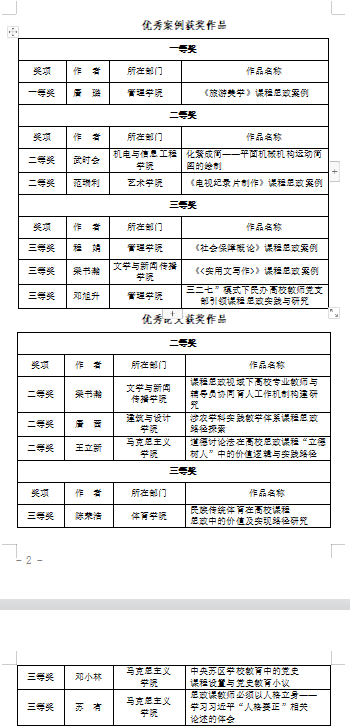 近日,重庆市2021年课程思政与思政课程(学科德育)优秀案例及论文评选活动结果出炉。在此次活动中,BEAT36512个项目获奖,其中优秀案例获一等奖1个、二等奖2个和三等奖3个;优秀论文获二等奖3个和三等奖3个。管理学院教师唐璐撰写的“旅游美学”荣获优秀案例一等奖。