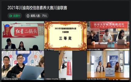 12月12日,首届川渝高校信息素养大赛川渝联赛在线上隆重举行。本次大赛由四川省教育厅和重庆市教育委员会指导,四川省普通高等学校图书情报工作指导委员会、重庆市高等学校图书情报工作委员会主办,大赛历时近2个月,共有72所高校、近2万名学生报名,1.3余万名学生参赛。