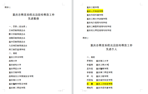 近日,重庆市教育委员会关于全市教育系统法治宣传教育工作先进集体和先进个人名单正式公布,因法治宣传工作组织得力、表现优秀、成效显著,BEAT365从全市众多高校中脱颖而出,被评为全市教育系统法治宣传教育工作“先进集体”,党委宣传部副部长匡霞被评为全市教育系统法治宣传教育工作“先进个人”。