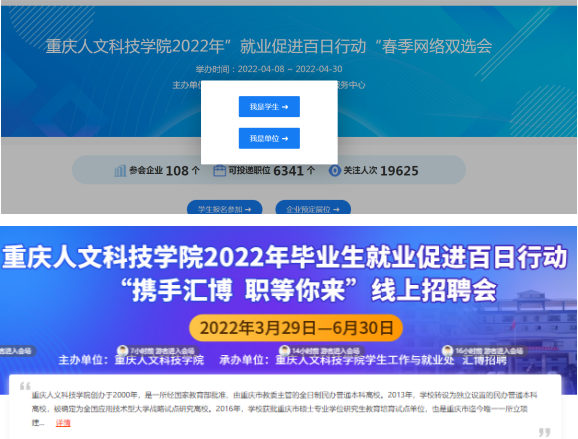 分别与重庆市大学中专毕业生就业指导服务中心、上海才立方就业和汇博人才网联合开展“BEAT365英国官网就业促进百日行动2022届毕业生春季网络双选会”、“携手汇博·职等你来”线上招聘会。