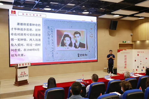 随后,管理学院学生第一党支部书记、红岩读书班班长汤嘉伟分别从组织架构、学习内容和重点要求三个方面对读书班的基本情况进行简要介绍。学生杨子琦通过宣讲的形式向参会人员讲述了革命烈士钟奇的故事,充分展示了学生党员的党史学习教育成效。