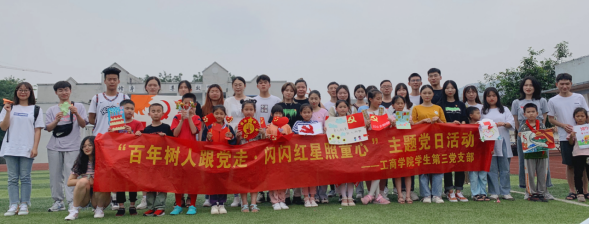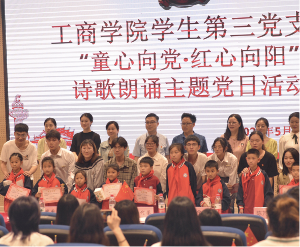 工商学院海丰楼112学术报告厅,学生第三党支部联合大庙村完全小学师生开展的“童心向党 红心向阳”诗歌朗诵主题党日活动正在进行。党员与帮扶留守儿童结对朗诵《我的祖国》《红船,从南湖启航》《与祖国同频共振》《峥嵘一百年,逐梦新时代》等诗歌,歌颂伟大的党和祖国,为我党百年华诞献上诚挚祝福。在组织开展大小活动过程中,该党支部针对关心关爱乡村留守儿童实施“三纳入”举措,实现了立足乡村振兴、积极爱党报国思想种子的生根发芽。纳入党支部组织生活。党支部把“乡村振兴战略”作为支部学习教育的重要内容之一,通过“三会一课”等形式,引导学生党员深入理解乡村振兴战略科学内涵及其重大意义,进一步强化理想信念;针对学校周边乡村留守儿童多的实际情况,通过主题党日等活动,把关心关爱留守儿童作为助力乡村振兴的重要途径纳入支部组织生活,让学生党员在关心关爱他人、积极服务社会的过程中不断强化宗旨意识。纳入“三下乡”暑期实践活动。为引导社区居民理性投资,防范金融诈骗,保护居民利益,全体党员积极参加工商学院暑期“三下乡”实践团,在草街街道十字路社区开展防范金融诈骗主题宣讲活动,帮助村民树立正确的投资理财观念,提高防金融诈骗意识及分辨能力,为建设美好新时代贡献青春力量。纳入“新23常能”实践教育活动。积极参加学校践行陶行知教育理念,创新开展的“新23常能”实践活动中,把有益于助力乡村振兴的会志愿服务、会表达、会交往、会带小学生、善展演等新常能作为实践重要内容,积极适应新时代应用型人才培养新要求,五育并举,有力促进全体党员爱祖国、立大志。
