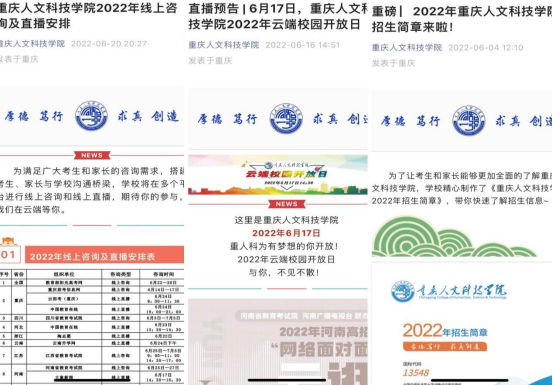 借助学校微信公众号、抖音视频号等社会影响力,开辟招生专栏,陆续发布学校宣传视频7条及招生简章、招生宣传活动安排和专业介绍等系列推文10余篇,为考生提供了全方位的信息服务。