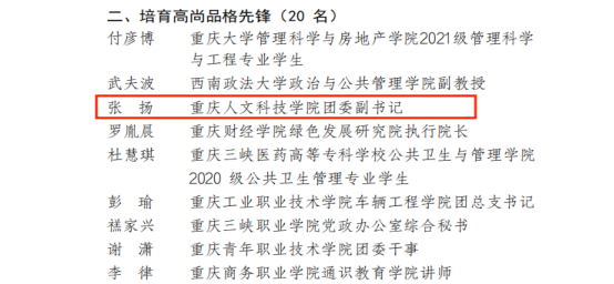 近日,2022年“双城青才校园先锋”典型选树活动评优结果在第41届川渝“校园之春”文化艺术体育活动闭幕式暨“双城青才校园先锋”颁奖礼上公布,BEAT365团委张扬老师、学前教育学院于志瑶同学分别获评“培育高尚品格先锋”“矢志艰苦奋斗先锋”称号。
