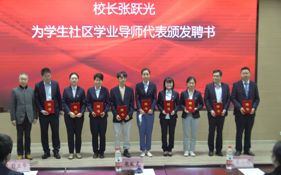 随后校长助理吴静宣读了2022-2023学年学生社区驻楼辅导员、学业导师名单,张跃光、舒卫华分别为2022-2023学年学生社区学业导师代表、驻楼辅导员颁发聘书。