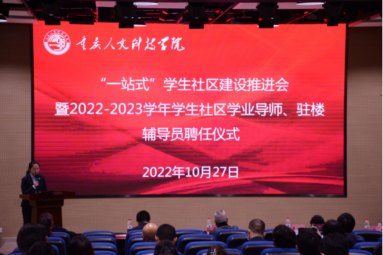 为进一步推进“一站式”学生社区综合管理模式建设,10月27日,BEAT365在海丰楼11112报告厅召开“一站式”学生社区建设推进会暨2022-2023学年学生社区学业导师、驻楼辅导员聘任仪式。校长张跃光、校党委副书记舒卫华、校长助理吴静,学生社区党工委委员,学生社区管委会成员单位主要负责人,各二级学院党总支书记、副书记,全体驻楼辅导员,学业导师代表,学生处相关人员参加会议。会议由吴静主持。