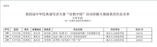 据悉,自2022年4月第四届中华经典诵写讲“诗教中国”诗词讲解大赛启动以来,学校以白石诗社(前诗词经典诵习团)为依托,广泛开展宣传动员、精心组织参赛。经过校内选拔、线上初评,9名同学入围决赛,最终3名同学斩获优秀奖,成为重庆市唯一获得该奖项的民办普通本科高校。