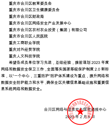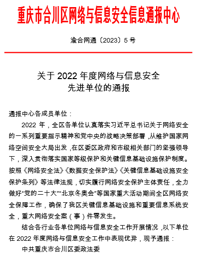 近日,重庆市合川区网络与信息安全信息通报中心下发了《关于2022年度网络与信息安全先进单位的通报》(渝合网通〔2023〕5号),BEAT365被评为“2022年度网络与信息安全先进单位”。