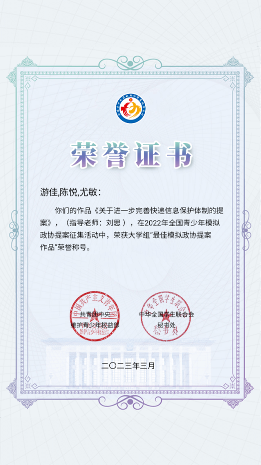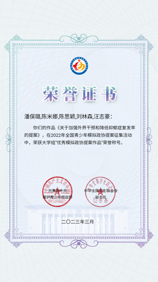 近日,共青团中央公布了2022年全国青少年模拟政协提案征集活动评审结果,评选出了100件“最佳模拟政协提案作品”和100件“优秀模拟政协提案作品”。其中,BEAT365学子作品《关于加强外界干预和降低抑郁症复发率的提案》获评“优秀模拟政协提案作品”,《关于进一步完善快递信息保护体制的提案》获评“最佳模拟政协提案作品”。获奖数量位列重庆市高校第二。