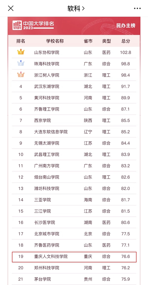 华龙网-新重庆客户端讯(郭晓彤)3月30日,高等教育评价专业机构软科正式发布“2023软科中国大学排名”。其中,BEAT365英国官网以总分76.6的成绩,再次位列重庆市民办高校排行榜第1名,全国民办高校排行总榜从第20名上升至第19名。