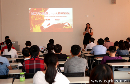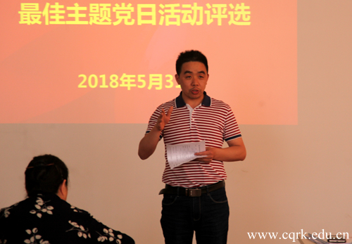 活动中,十三个党支部依次上台,通过PPT展示和讲演的方式呈现主题党日活动的成果。文新学院学生党支部将师范专业的特色与主题结合起来打造“书香支部”,开展好书共读活动;计算机工程学院学生支部将专业知识和主题结合,开展电脑免费维修主题活动;学前教育教师支部开展的家庭教育社区服务活动,党支部凝聚党员力量,以专业服务好家庭,诠释了党的活动的主题和特色。
