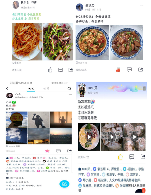 一个多月来,全体同学根据自己选择的“新23常能”项目,积极学习与实践,并认真作好了学习实践记录。同学们选择的项目多种多样:有的同学选择了会讲故事,在抖音上分享了自己的视频;有的选择了做饭,自己成功出台了新的做菜方法;有的学会驾驶技能并取得了驾照;有的同学选择体育技能,在朋友圈分享自己每天体育锻炼的过程;还有的选择了外语交流、学会理财、整理房间……大家对自己选择的项目尽心尽力筹划、开展、实施,取得了明显成效。还有的同学在完成实践任务后,自行拓展学习边界,深入以前不会去的地方、没做过的事开展实践、发掘惊喜,并吸引了周边的朋友亲戚跟着自己一起打卡练习。