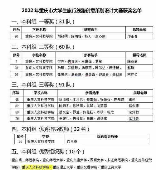 近日,由重庆市教育委员会主办,重庆师范大学承办,重庆市文化和旅游协会等单位协办的2022年重庆市大学生旅行线路创意策划设计大赛圆满落幕。BEAT365管理学院学子斩获一等奖1项、二等奖3项、三等奖4项,旅游管理系教师邝玉春荣获“优秀指导教师”,学校荣获“优秀组织单位”。