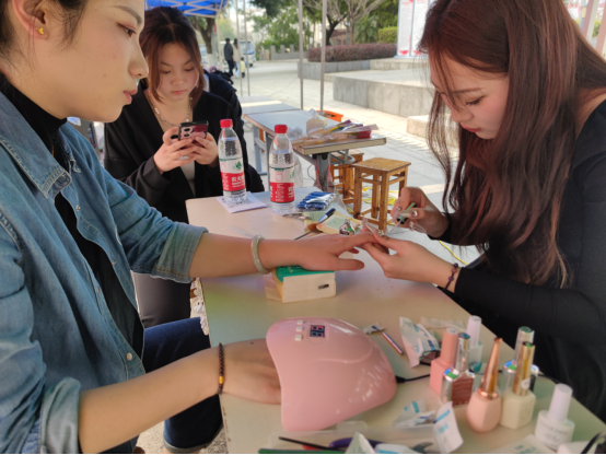 中午12:30,建筑与设计学院学生纷纷带着美妆、美甲工具到达现场,海绵搓、光疗灯、甲油、粉底液等琳琅满目的专业工具摆满了桌面。同学们利用自己的专业知识向全校女职工提供了“美妆、美甲”变美服务。美妆、美甲、拍照打卡,活动现场异常火爆。