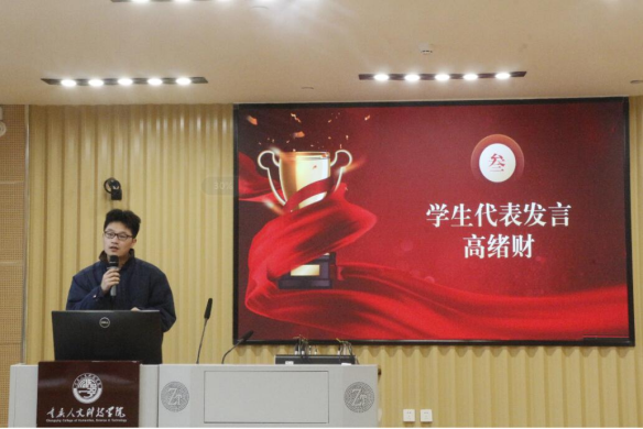 学生代表高绪财进行会议交流,分享了自己参赛的经验。他表示大赛开赛在即,最重要是打牢基础,要以往届大赛真题为基础,刷真题而并非钻难题,他认为学习理论知识的同时还要注重实践,鼓励同学们要勇于创新、多试错、不怕错,脚踏实地的为赛事做好准备。